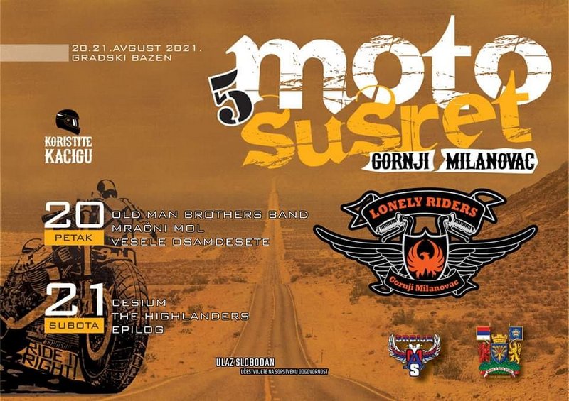 Moto Klub "Lonely Riders" (MAS) organizuje peti po redu moto susret za sve bajkere i bajkerke iz svih delova naše zemlje i okruženja. Uz hladna pića, dobru zabavu, fenomenalne rock bendove, besplatnu klopu i kao uvek besplatan ulaz za sve, dokačekaće Vas članovi ovog moto kluba. Vidimo se!