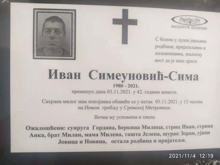 Sahrana će se obaviti u petak 5.11.2021 u 13 časova na novom groblju u Sremskoj Mitrovici.