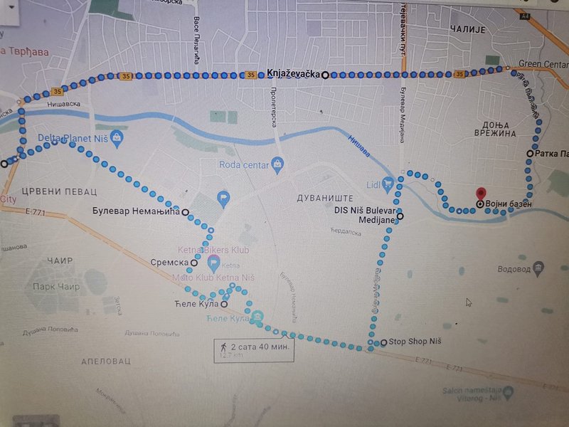 Vozi se Knjaževačkom do auto pijace, zatim do 7 jula, nastavlja se bulevarom Nemanjića do Sremske, iz Sremske u bulevar Zorana Đinđića pored Ćele Kule do Stop Šopa gde skrećemo u bulevar Medijana, prolazimo pored DIS-a i nazad na Vrežinu.