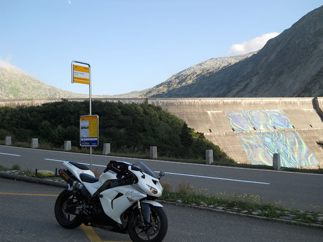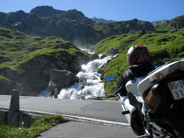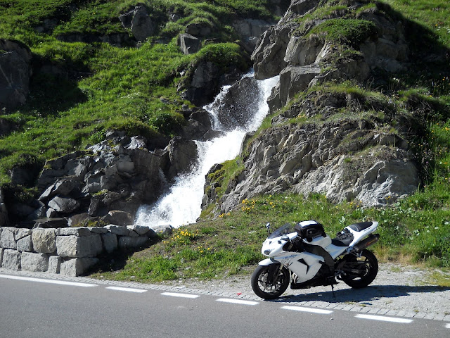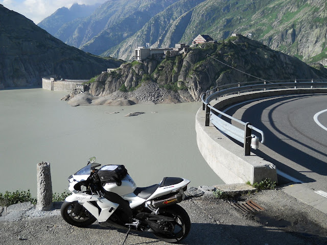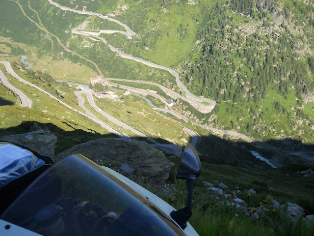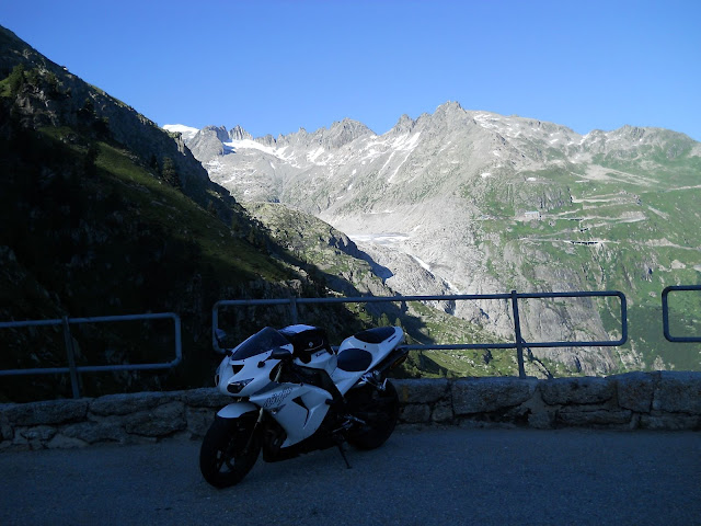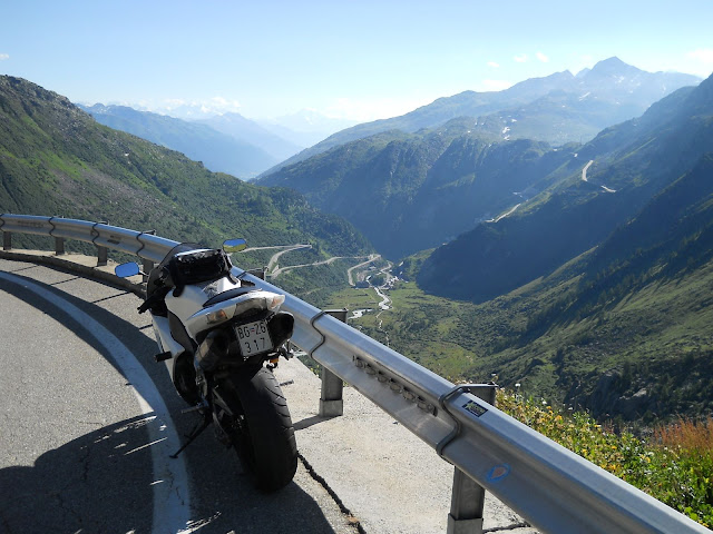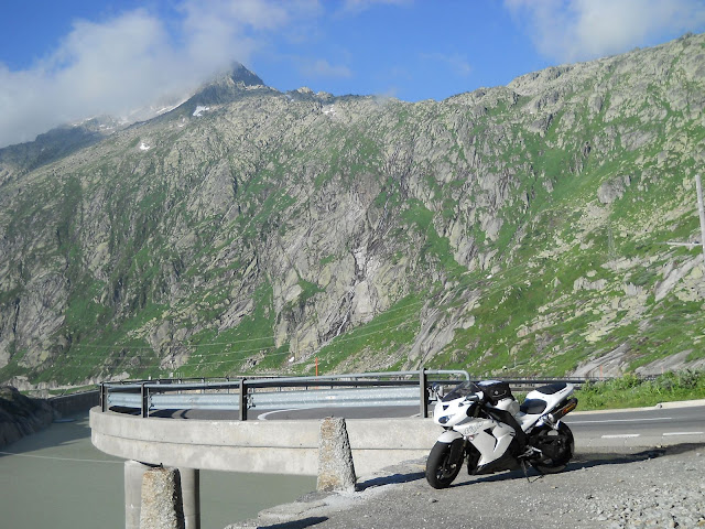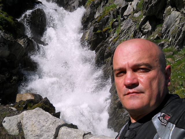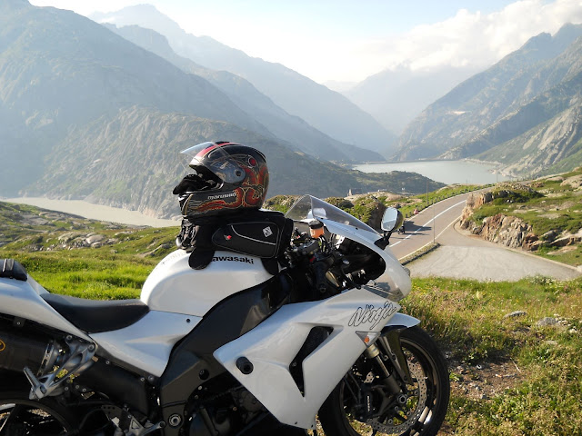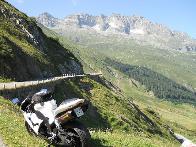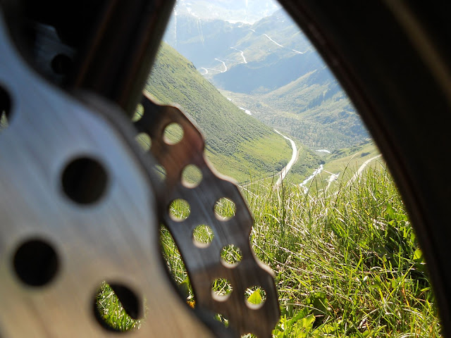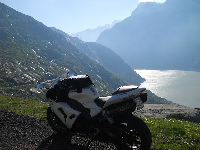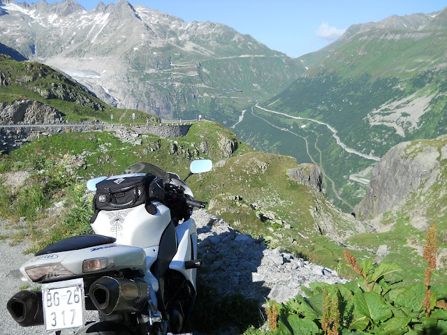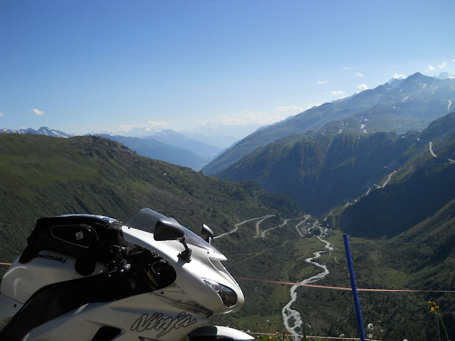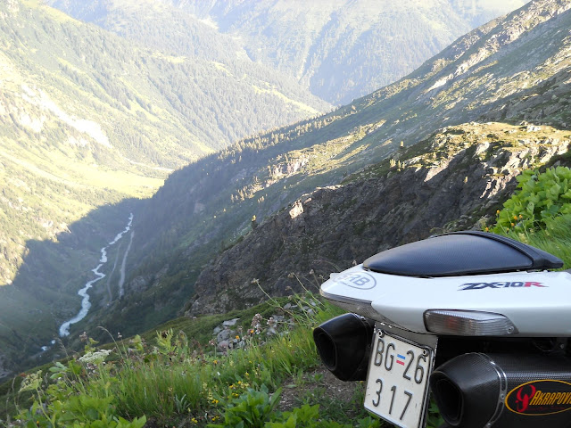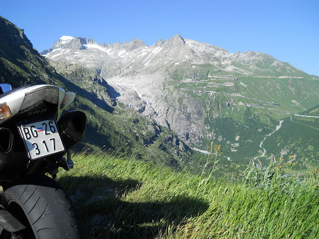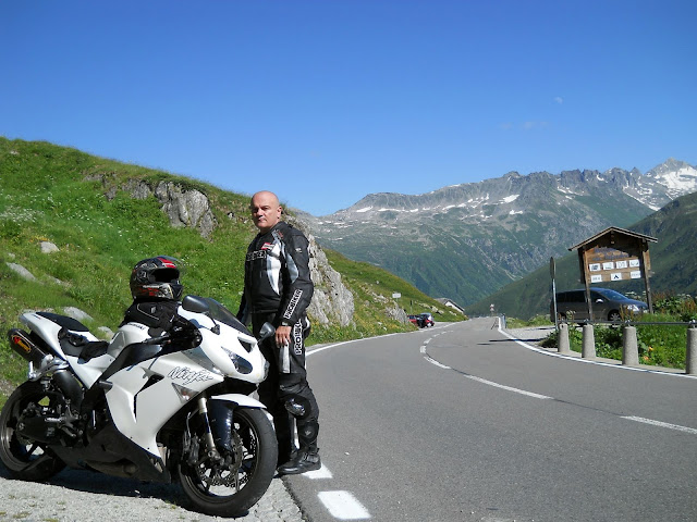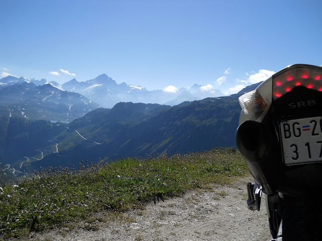Put prema Grimselu je vijugav...asfalt fenomenalan....jedan BMW M5 mi se nesto mnogo trti.....oduvao sam ga ...asfalt je fenomenalan...u lakat krivinama motor obaram maltene do kraja...par puta mi zadnja guma leluja...bitno je da prednja drzi kako treba......napalio sam se kao majmun.....ceo dan sam vozio po enduro stazama....a onda se javi moj drug Velimlje...kucka me po ramenu.....kaze ...a ko ce da napise putopis i postavi slike ako se sada slupas.....zar ces upropastiti ovako divan dan.....hm...u pravu je jedva se suzdrzavam.....iza ledja nam ostaje sve ono sto sam prosao...put vijuga kao zmija i sa ove strane ima drugu dimenziju..stajem i slikam...opet i opet i opet.....