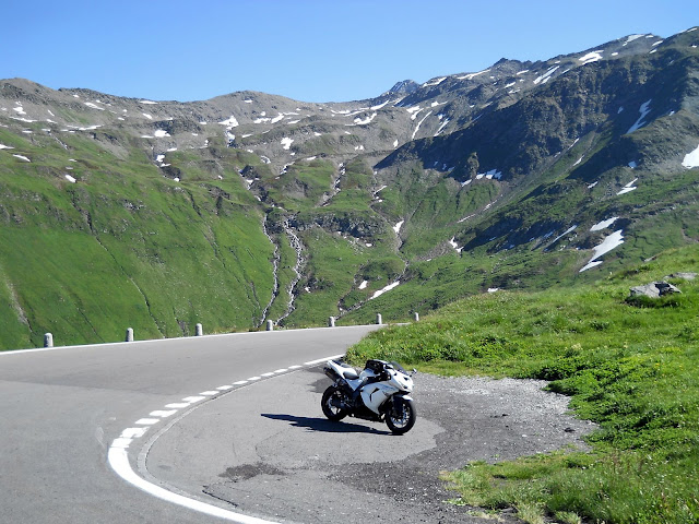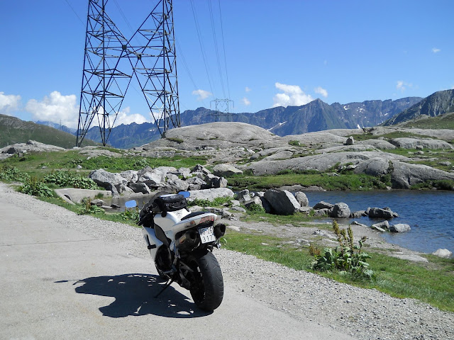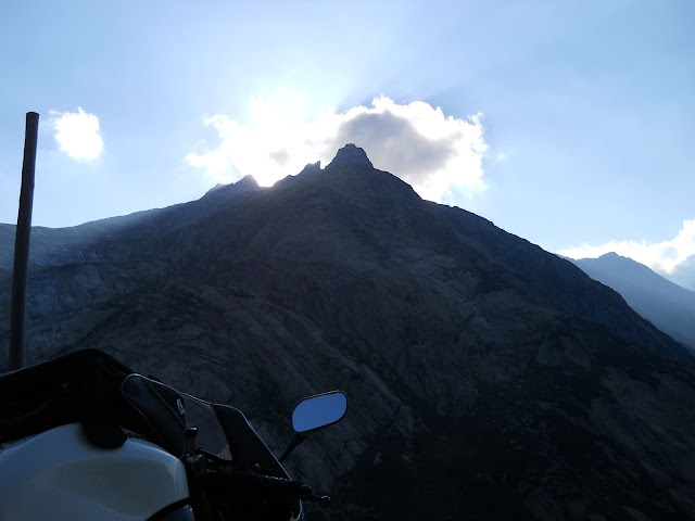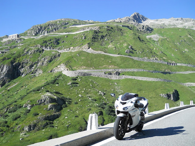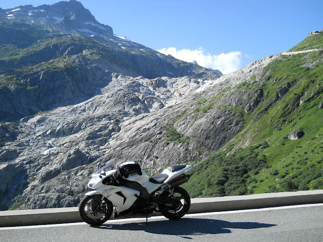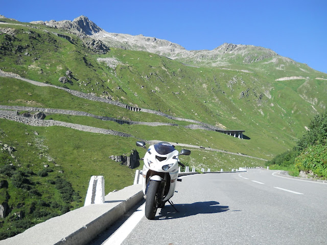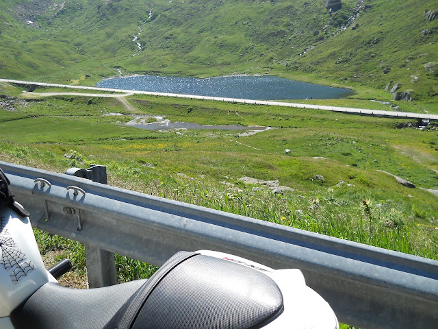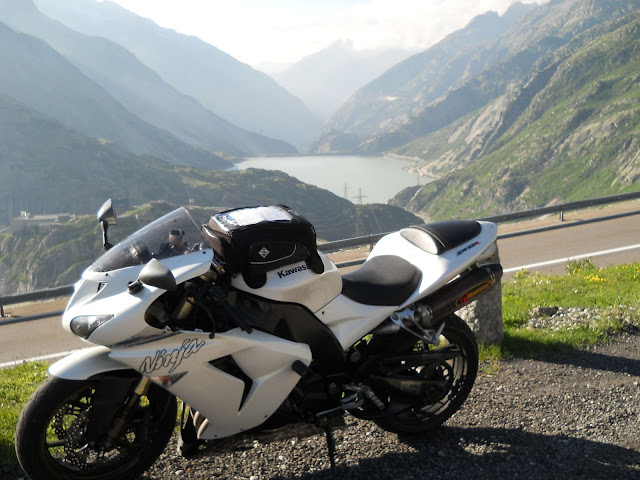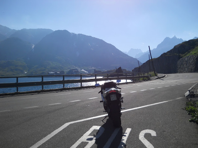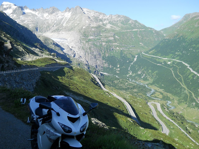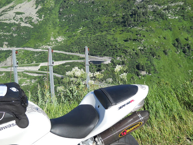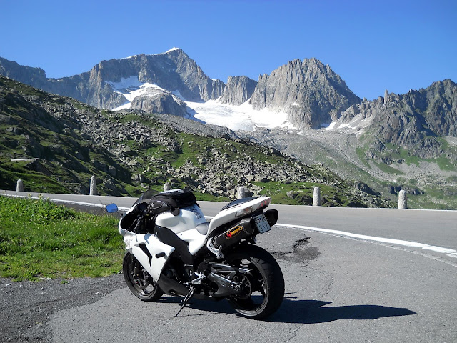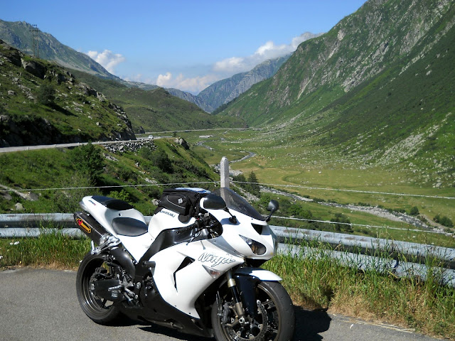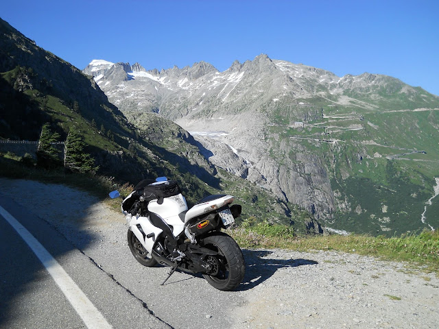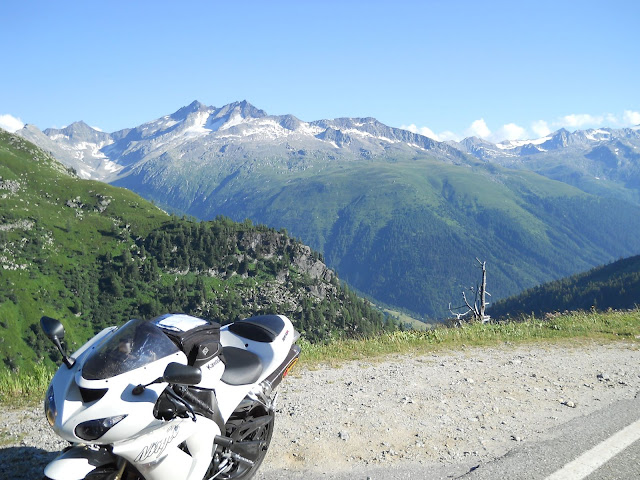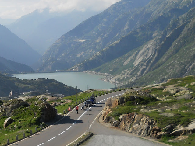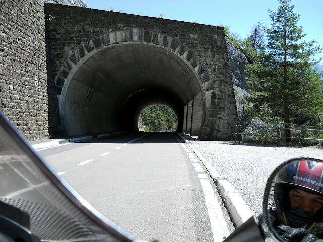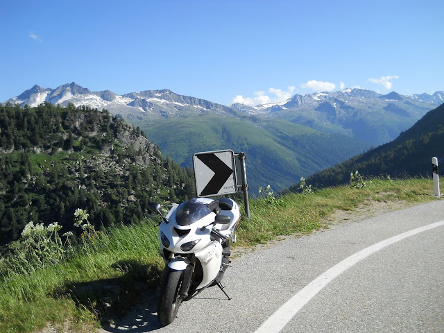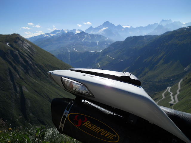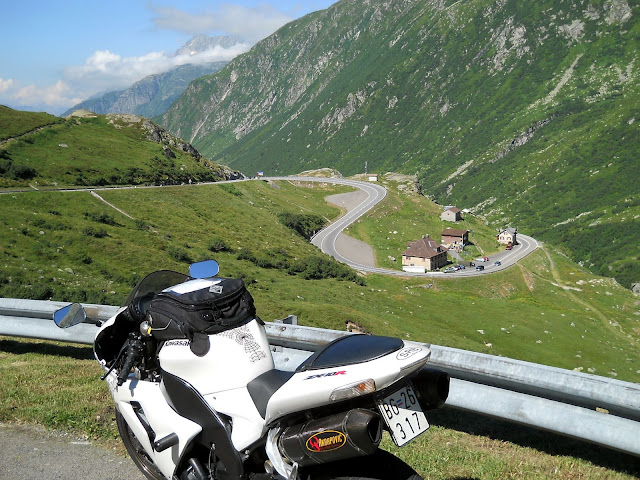 Put prema Grimselu je vijugav...asfalt fenomenalan....jedan BMW M5 mi se nesto mnogo trti.....oduvao sam ga ...asfalt je fenomenalan...u lakat krivinama motor obaram maltene do kraja...par puta mi zadnja guma leluja...bitno je da prednja drzi kako treba......napalio sam se kao majmun.....ceo dan sam vozio po enduro stazama....a onda se javi moj drug Velimlje...kucka me po ramenu.....kaze ...a ko ce da napise putopis i postavi slike ako se sada slupas.....zar ces upropastiti ovako divan dan.....hm...u pravu je jedva se suzdrzavam.....iza ledja nam ostaje sve ono sto sam prosao...put vijuga kao zmija i sa ove strane ima drugu dimenziju..stajem i slikam...opet i opet i opet.....