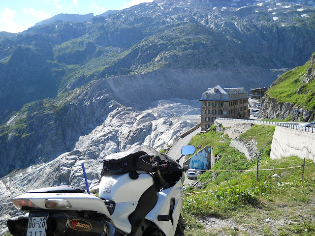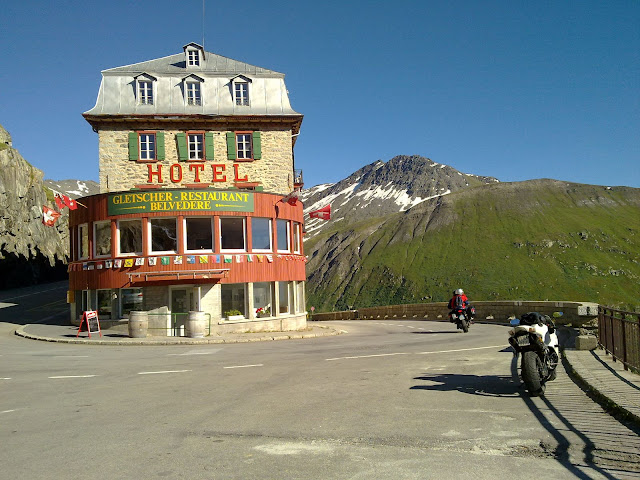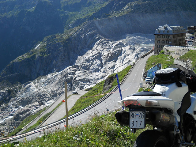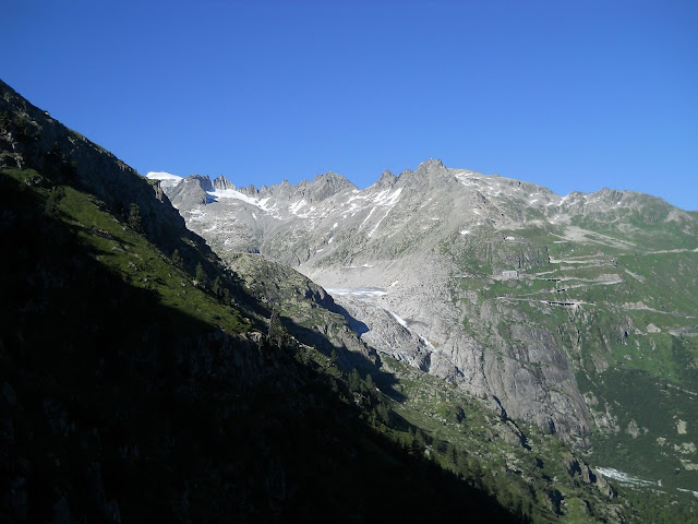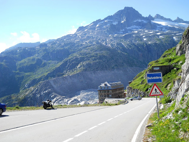 Sa Furkapassa dolazim u mesto koje se zove Belvedere.....selo Gletch je odmah ispod tu se proteze cuveni glecer Rone...na severoistoku Kantona Valais i u centralnim Alpima Svajcarske, Glecer zauzima povrsinu od oko 17km2 i proteze se u duzinu preko 10 kilometara sa prosecnom sirinom od 1 km.