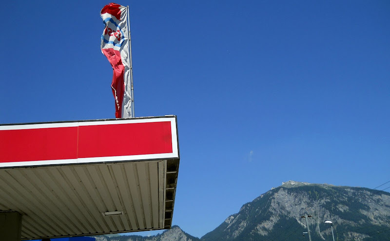 Vec je i dva sata......krecem nazad u Luzern ali neidem autoputem....ajd da prodjem kroz predvorje......sve vreme mi nas Velimlje u mozgu...da je on ovde on bi u Bonadusu skrenuo levo....ja stajem da sipam gorivo pred racvanjem.....gledam zastavu na pumpi....vetar samo sto je ne pocepa.....kako li je gore?