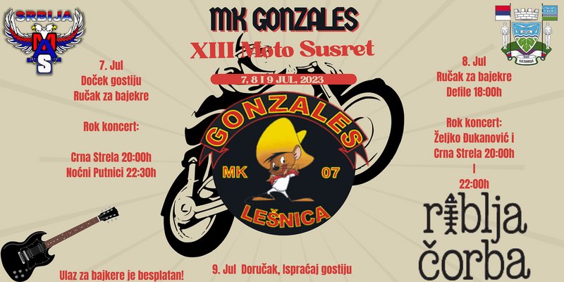 Tema: 7,8,9 JUL 2023 - XIII MOTO SKUP MK GONZALES (MAS) - LEŠNICA (Pročitano 1715 puta)