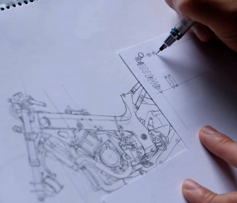 Počevši od pronalaženja šema i nacrta na mreži, Yoshiwo prenosi planove i obrise za svaki dio na papir, koristeći reflektore za svetlo gdje je to moguće - ali često i prozore, monitore, čak i ekran svog pametnog telefona kako bi pružio svetlo za skiciranje svojih planova u različitim oblicima papira - kartice, priznanice, korice itd.