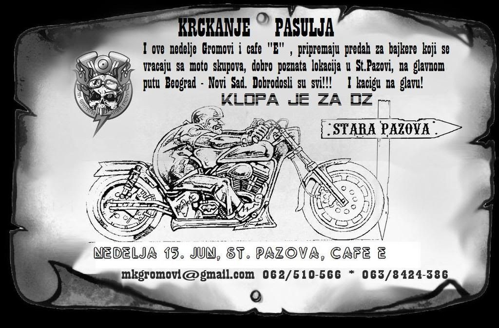 Mi skoro svake nedelje radimo neko krckanje u ovom kaficu, mnogo cesto bajkeri prolaze, vecina njih svrati, nekima nije jasno ili zure pa nesvrate, pa da znate kad naidjete u pazovi na glavnom putu, bg -ns i vidite parkirano brdo motora, slobodno svratite, klopa je uvek za dz, ove nedelje kuvamo pasulj, i ovom prilikom postavljam plakat, fotke sa nasih "krckanje zurki" mozete pogledati na: bice vam mnogo jasnije